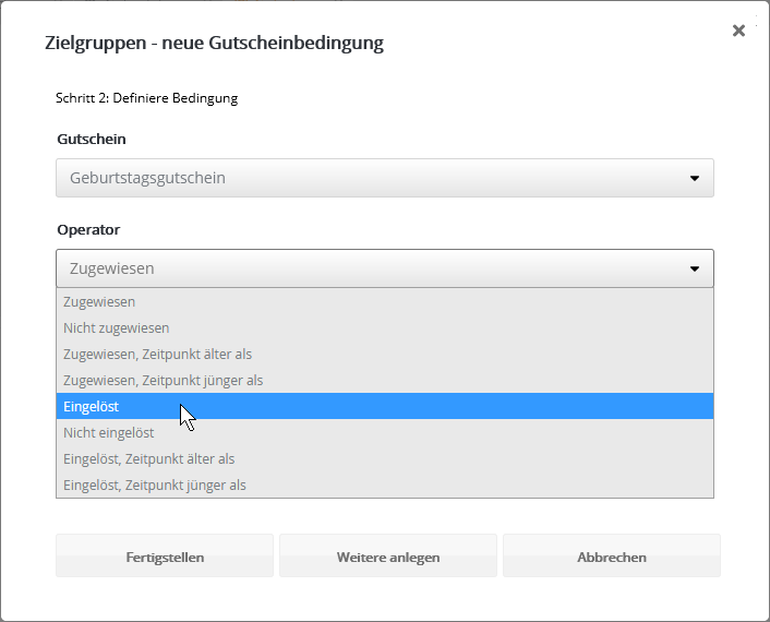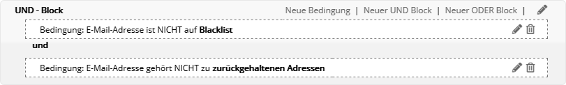 Insbesondere nach dem Kopieren einer vorhandenen Zielgruppe kann das sinnvoll sein, wenn die identischen Abonnenten in Original und Kopie nicht gewünscht sind. Bedingung anhand GutscheinFiltern Sie Abonnenten danach, ob und in welchem Zeitraum die Zuweisung oder Einlösung eines Gutscheins stattfand. Tipp: Um zugewiesene Gutscheine als eingelöst zu markieren, nutzen Sie entweder die Webservice-Funktion 'RedeemVoucherByCode' oder importieren in der Gutscheinübersicht eine CSV-Datei mit den eingelösten Gutscheincodes. Bedingung anhand SelektionMit diesem Bedingungstyp nutzen Sie eine per Webservice angelegte Selektion von Abonnenten als pixelconcept-Mailingsystem-Zielgruppe. Der Bedingungstyp ist nur dann sichtbar, wenn per Webservice mindestens eine Selektion angelegt wurde. Das Besondere: In einer Selektion werden Abonnenten anhand einer Liste von IDs gruppiert. So lässt sich eine extern getroffene Abonnentenauswahl als Zielgruppe nutzen, ohne dass in den pixelconcept-Mailingsystem-Abonnentendaten ein gemeinsames Merkmal vorliegen muss. Die Details entnehmen Sie bitte der Webservice-Dokumentation, die wir Ihnen gern zusenden. Bedingung anhand des Empfängers (geplant)Diese Bedingung entscheidet, ob ein Abonnent als Empfänger eines bestimmten Mailings vorgesehen war oder nicht. Das bedeutet, dass er in einer Abonnentenliste bzw. Zielgruppe für ein bestimmtes Mailing steht, welches versandt wurde. Im Unterschied zur letztgenannten Bedingung wird der tatsächliche Empfang jedoch nicht geprüft. Es sind auch alle Empfänger enthalten, die das Mailing z. B. aufgrund von Bounces, Blacklists oder serversseitigen Spamfiltern nicht empfangen haben. Bedingung anhand des Empfangens (zugestellt)Diese Bedingung entscheidet, ob jemand ein bestimmtes Mailing empfangen hat oder nicht. Das Mailing gilt als empfangen, wenn der E-Mail-Server des Abonnenten eine positive Rückmeldung erteilt hat. Im Schritt nach dem Empfang ist es dennoch möglich, dass das Mailing beim Empfänger in einem Spamordner landet. Bedingung anhand des BounceverhaltensDamit legen Sie Bedingungen anhand der Zustellungen oder Nichtzustellungen eines bestimmten Mailings an. Bedingung anhand Blacklist bzw. Zurückgehaltener AdressenAbonnenten, deren E-Mail-Adresse auf einer Blacklist oder der Liste der zurückgehaltenen Adressen steht, werden automatisch vom Versand ausgeschlossen. Dieselben* Abonnenten lassen sich per Zielgruppe filtern, etwa um sie beim Export Ihrer Abonnentendaten ebenfalls auszuschließen. Die kombinierte Zielgruppe sieht wie folgt aus: