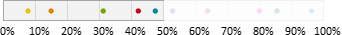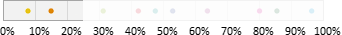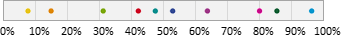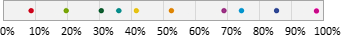 Auswahl-Wahrscheinlichkeit in ProzentGeben Sie einen Prozentwert zwischen 0 und 100% ein. Mit dieser Wahrscheinlichkeit gehört ein Abonnent zur Zielgruppe. Beispielsweise bewirkt ein Wert von 25%, dass ungefähr (siehe Hinweis) ein Viertel aller Abonnenten zur Zielgruppe gehören. Dazu verteilt pixelconcept-Mailingsystem alle Abonnenten auf einem Zahlenstrahl zwischen 0 und 100%. Bei 10 "bunten" Abonnenten könnte eine Variante so aussehen: