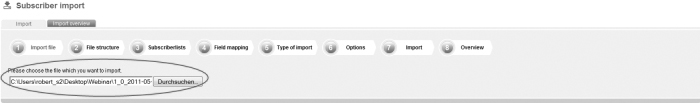 Save the file as a file with the feature 'CSV (Comma delimited)'. Apple user: If you own an apple computer, you will have to safe the file as 'CSV-Windows'. pixelconcept-Mailingsystem does not run files in the Mac format. Step 1 – Import fileOn the navigation bar click on 'Subscribers' and then go to the navigation subitem 'Import'. This is the way how you get to the menu-guided import function of pixelconcept-Mailingsystem. First, you will have to choose the file which you want to import; |
