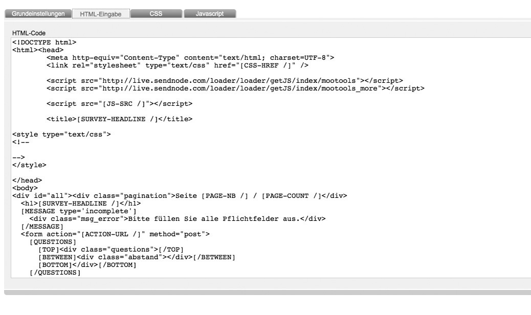 Insert your entire html source code. By creating a new template, pixelconcept-Mailingsystem generates a sample html source code with all important survey-placeholders automatically in this tab.