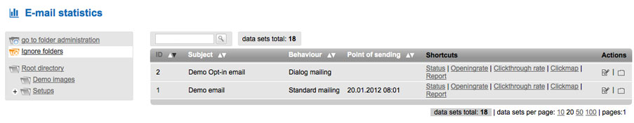 Here you find the statistics of all sent mails. For easier access pixelconcept-Mailingsystem already includes a demo-mail you can view. |