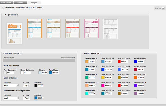 Now you also can adjust the design of your report. Choose the tab 'designs'. By default pixelconcept-Mailingsystem suggests you six different layouts. HTML experts can also open the 'advanced settings' below the layouts to edit the html-code. For example you can insert your logo in th header.