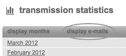In the transmission- statistic you see the data collected from pixelconcept-Mailingsystem (Traffic, Total). Also you see, if exist, the numbers of test-sendings, clicks on the subsriber-link and the number of subscribers who have completed the optin-confirmation. Next to the view 'display months' you also can select 'display e-mails'. So pixelconcept-Mailingsystem outputs the above mentioned figures for each mailing.