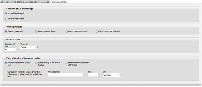 In the last tab you define the settings for the dispatch. Determine by which criterion (opening-rate or click-through-rate) pixelconcept-Mailingsystem should identify the winner. Equally important is to determine the duration of the test.