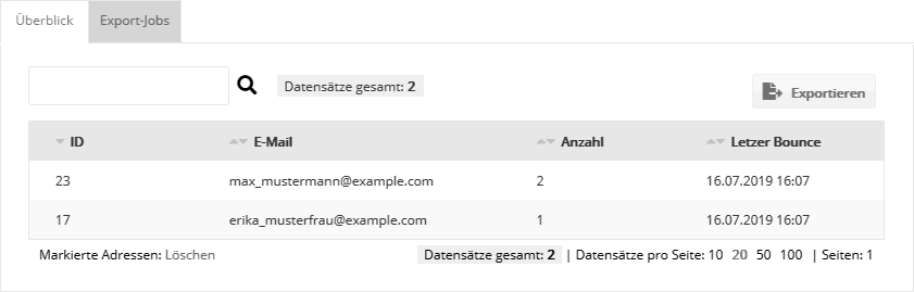 Reiter 'Überblick'Hier werden alle E-Mail-Adressen aufgelistet, deren Versendungen aufgrund von drei aufeinanderfolgenden Hardbounces zurückgehalten werden. Diese Adressen werden auf der pixelconcept-Mailingsystem-internen 'Retained List' gesammelt. Verwaltet werden hier ausschließlich die reinen E-Mail-Adressen, unabhängig von den dazugehörenden (eventuell ehemaligen) Abonnenten. Oben rechts können Sie mit Klick auf den 'Exportieren'-Button die zurückgehaltenen E-Mail-Adressen als CSV-Datei exportieren. Die erzeugte CSV-Datei lässt sich anschließend auf dem Reiter 'Export-Jobs' herunterladen.