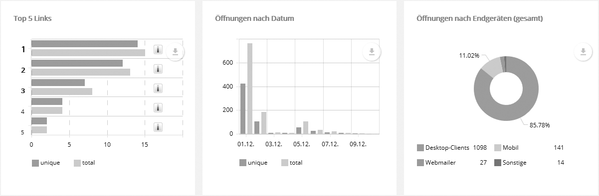 Per Klick auf 'Vollbild' wird die Karte im gesamten Fenster dargestellt. Direkt unter dem Vollbild-Link können Sie per Download-Button die Grafik der Karte in verschiedenen Formaten herunterladen. Hinweis: Obwohl IP-Adressen grundsätzlich nicht an einen bestimmten Ort gebunden sind, lässt sich durch die bekannten IP Adressräume von Internetprovidern, Universitäten und ähnlichen Einrichtungen in vielen Fällen der Standort ermitteln. Da regionale Einwahlknoten häufig einen festen IP-Adresspool besitzen, funktioniert das Verfahren auch bei dynamischer IP-Vergabe. Für die Zuordnung nutzt pixelconcept-Mailingsystem eine regelmäßig aktualisierte lokale Kopie einer Geotargeting-Datenbank, die ein externer Dienstleister zur Verfügung stellt. --> Top 5 Links + Öffnungen nach Datum und EndgerätenWie bei jedem anderen Diagramm lassen sich auch hier per Download-Button (rechte obere Ecke) die angezeigten Daten als Grafik- oder Excel-Datei herunterladen. Einzelne Diagramm-Segmente lassen sich ein- oder ausblenden, indem man auf den entsprechenden Punkt in der Legende klickt, z.B. auf 'Desktop-Clients' im Diagramm 'Öffnungen nach Endgeräten'. Damit werden die übrigen Segmente auf 360° gezoomt und deren Prozentzahlen passen sich der neuen Anordnung an. So lässt sich das Verhältnis beliebiger Segmente direkt vergleichen.